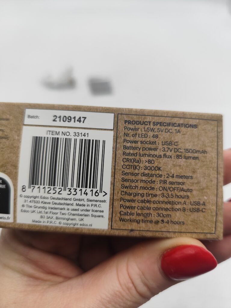 Model wyposażony jest w 48 diod LED o ciepłej barwie 3000K, dzięki czemu światło jest przyjemne dla oka i nie razi w nocy. Wbudowany akumulator 1500 mAh ładowany przez USB-C eliminuje potrzebę używania baterii jednorazowych.