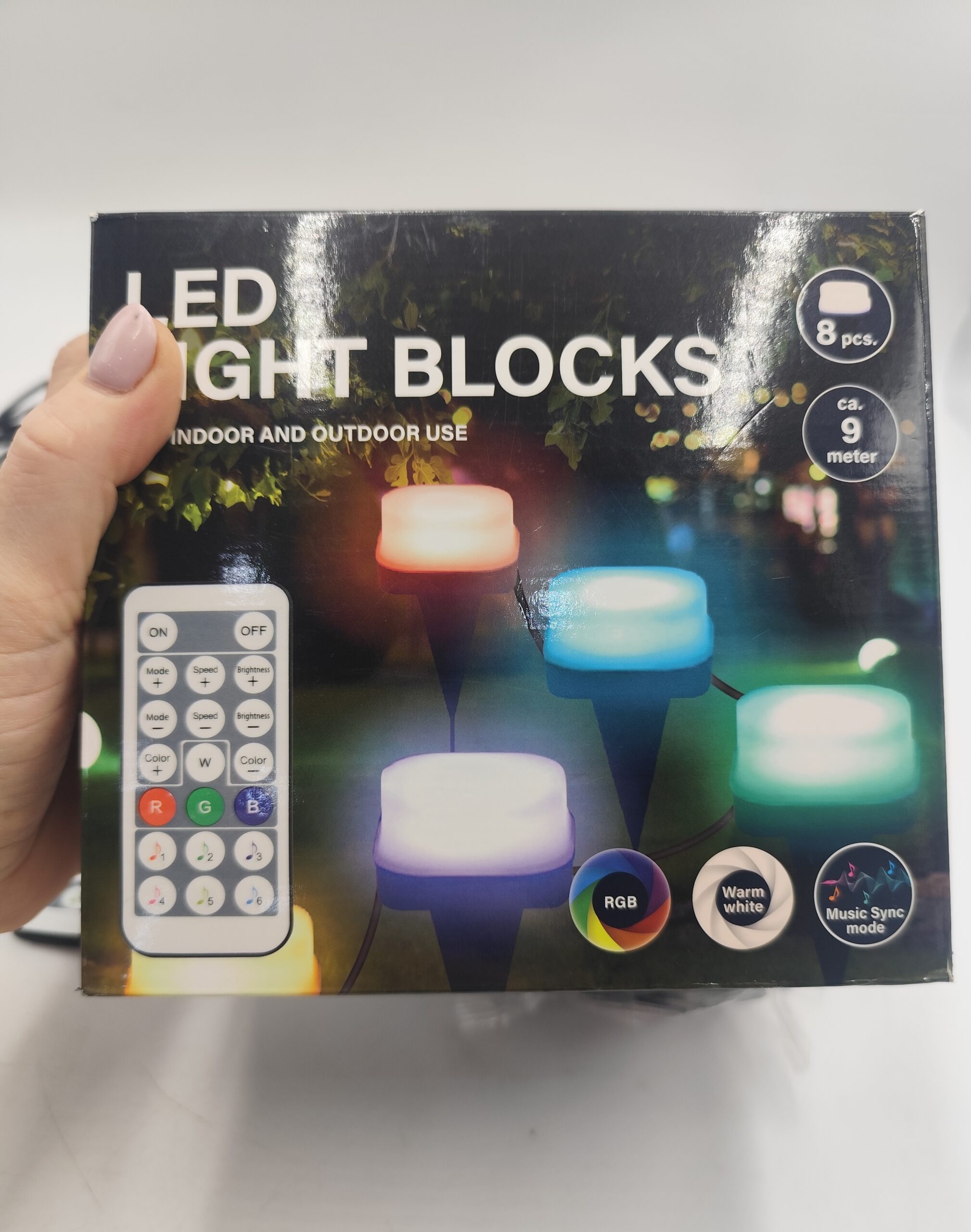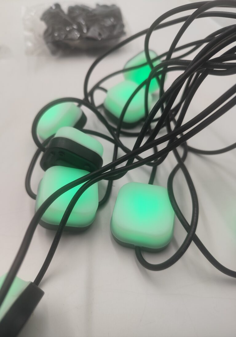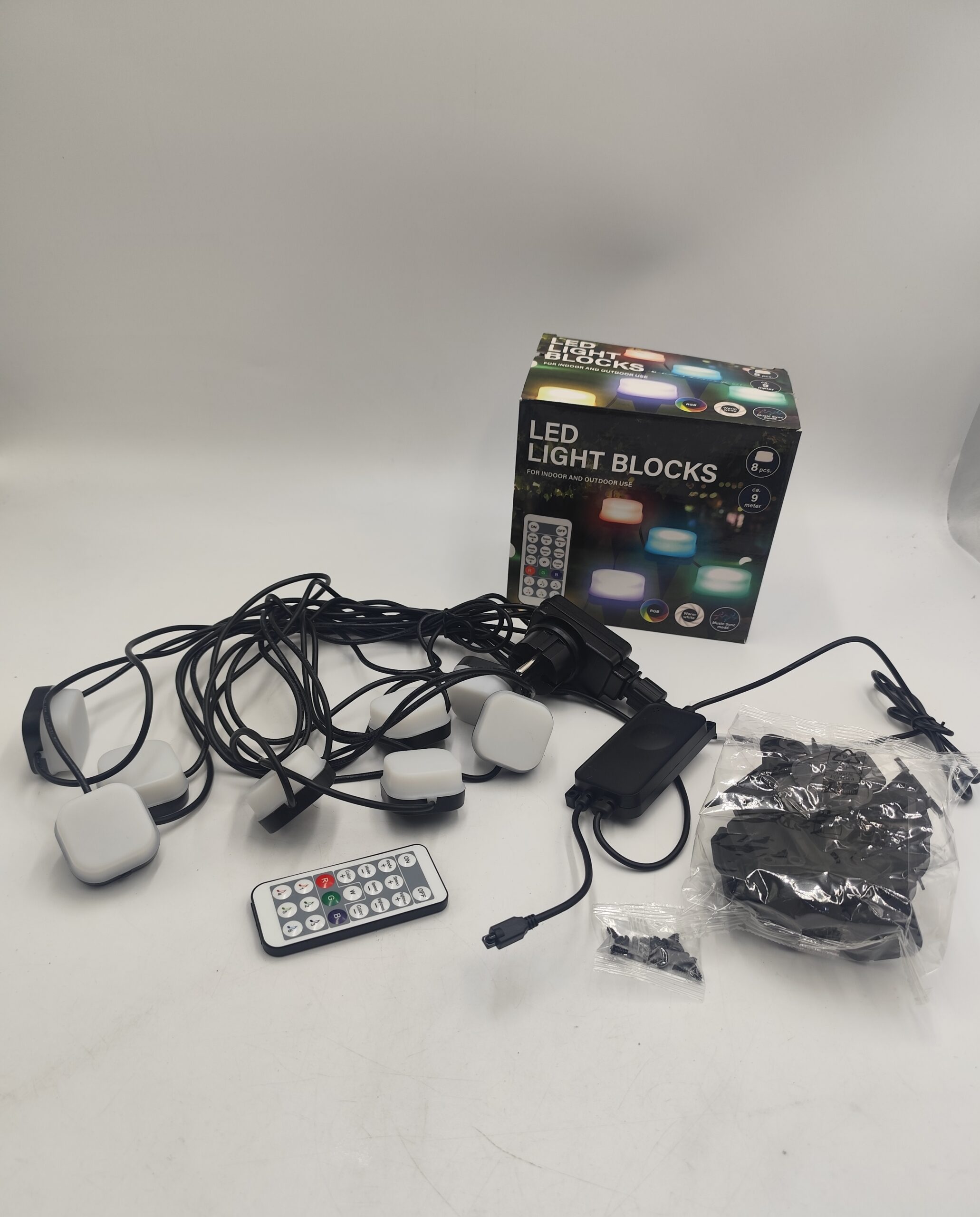 Zestaw zawiera 8 kostek LED połączonych przewodem o długości około 9 metrów. Lampki nadają się do użytku zarówno wewnątrz, jak i na zewnątrz.
