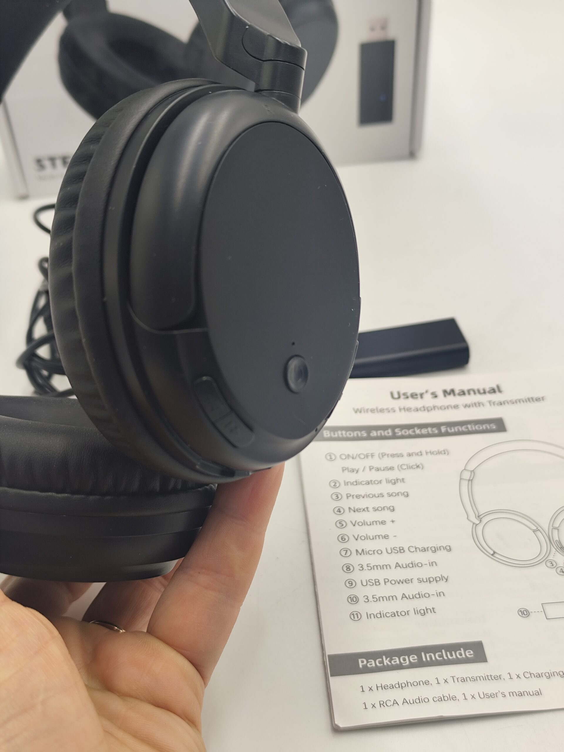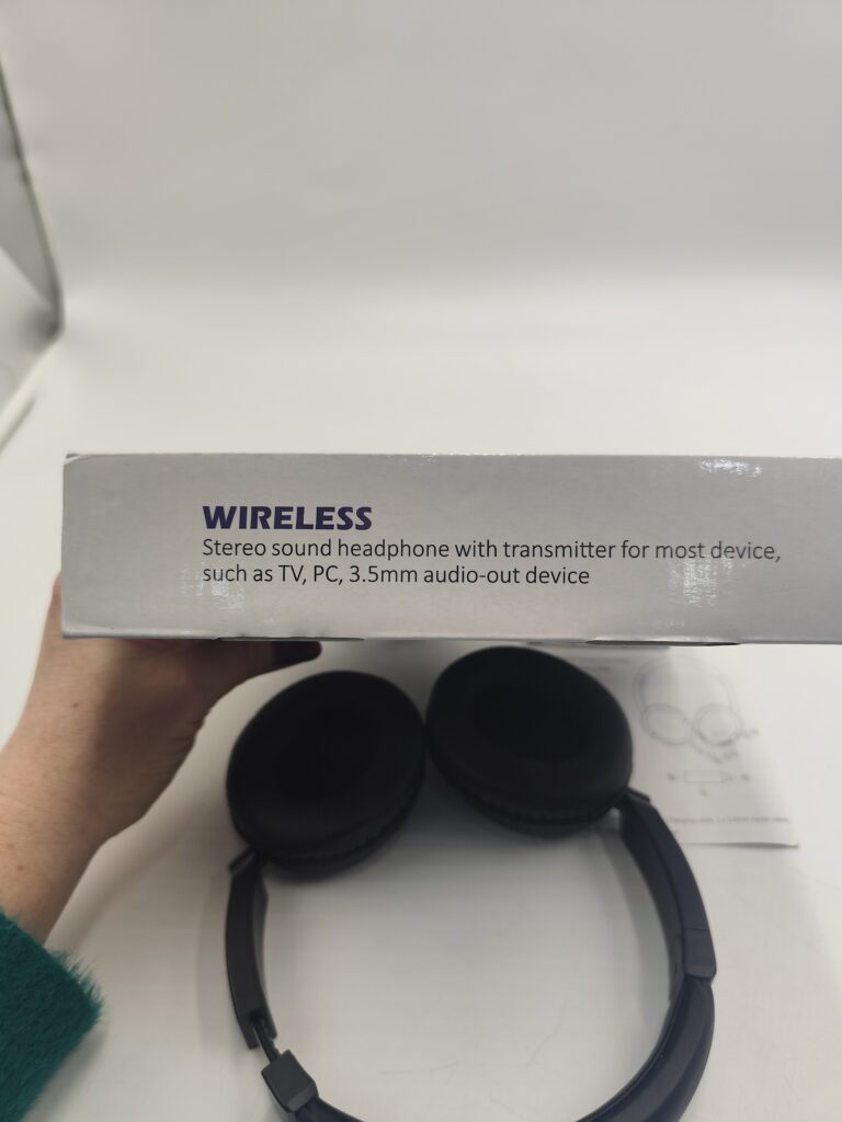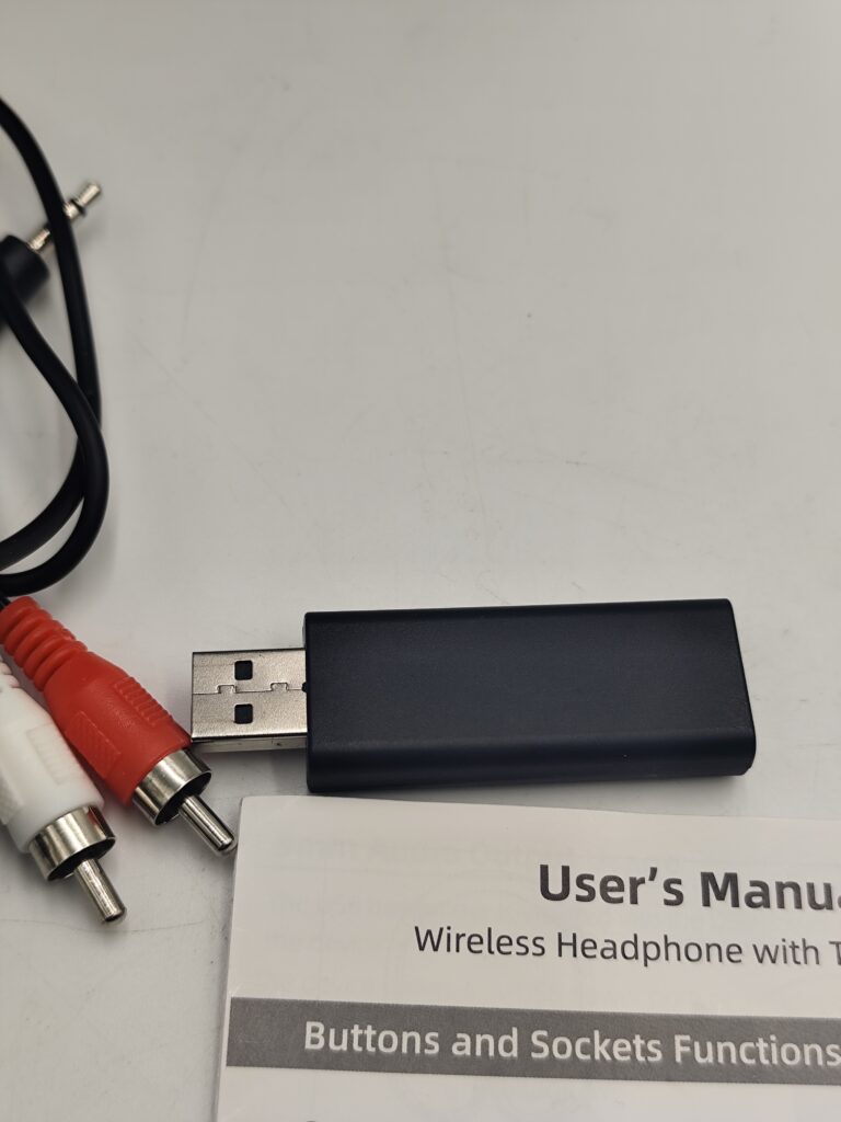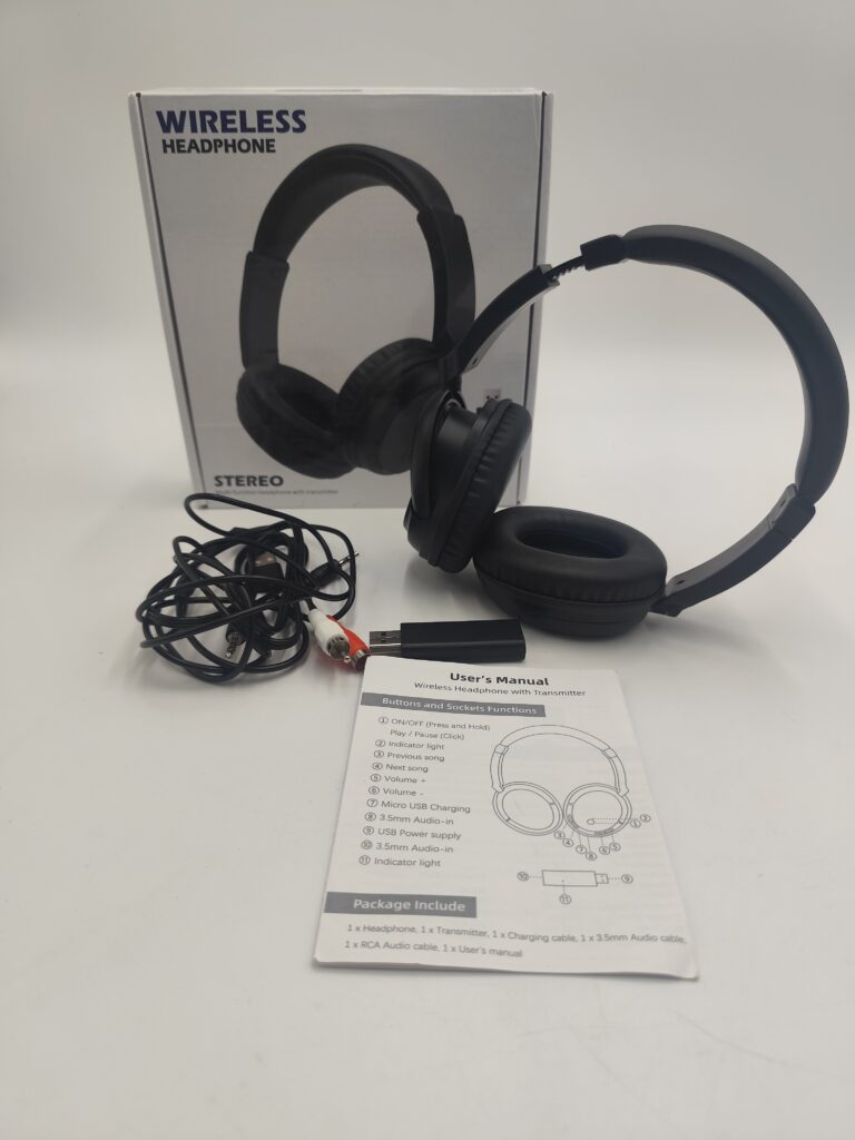 Bezprzewodowe słuchawki stereo z transmiterem USB umożliwiają wygodne słuchanie dźwięku z telewizora, komputera lub innych urządzeń audio bez plączących się kabli. Zestaw pozwala również na korzystanie przewodowe dzięki kablom AUX i RCA.