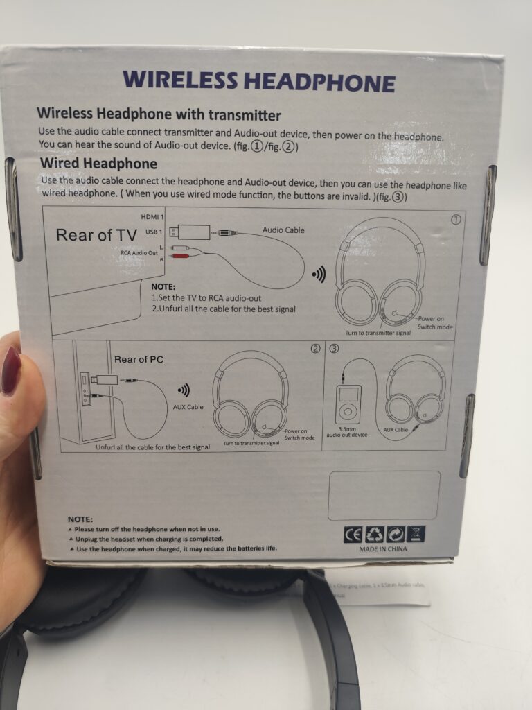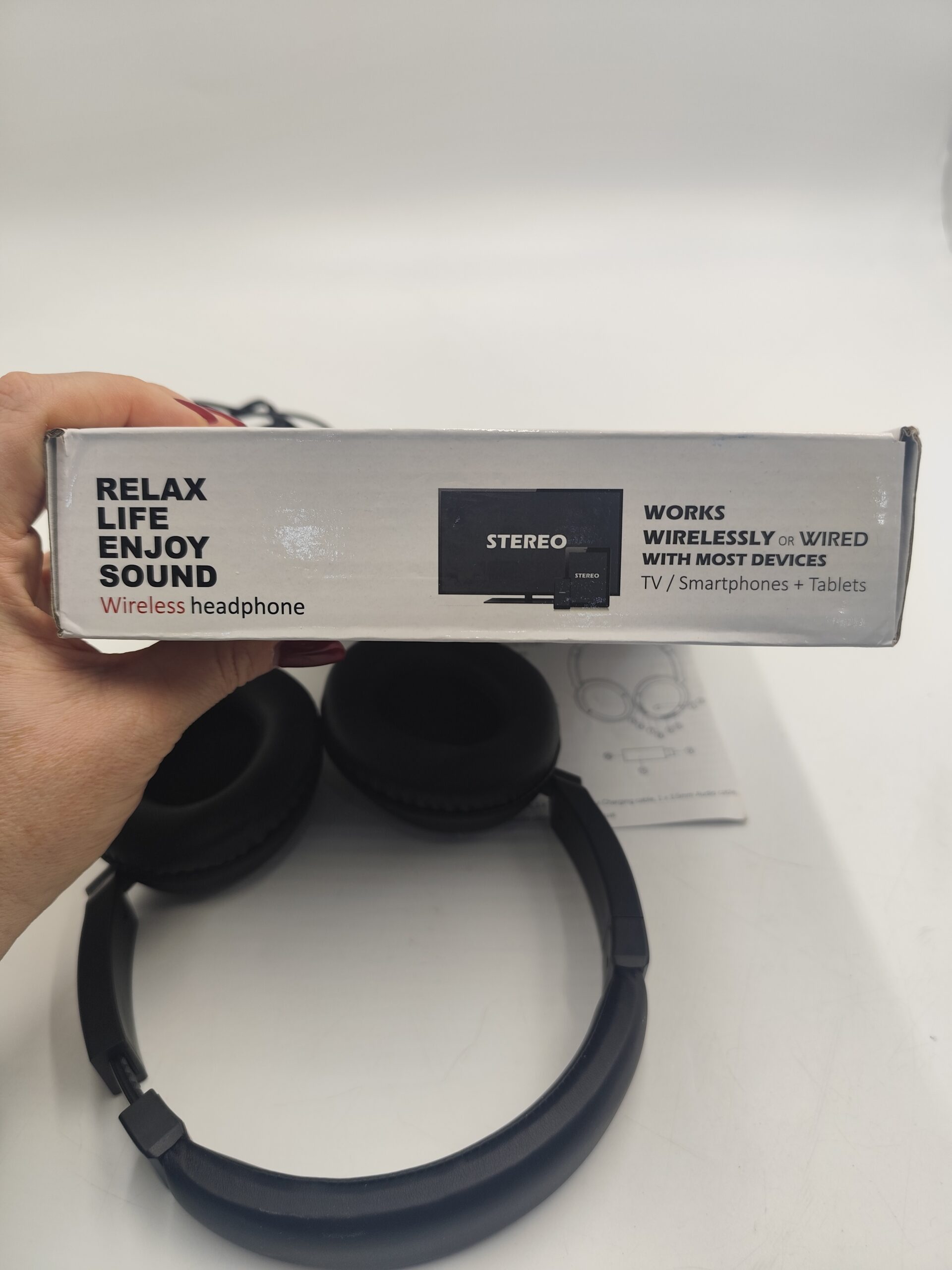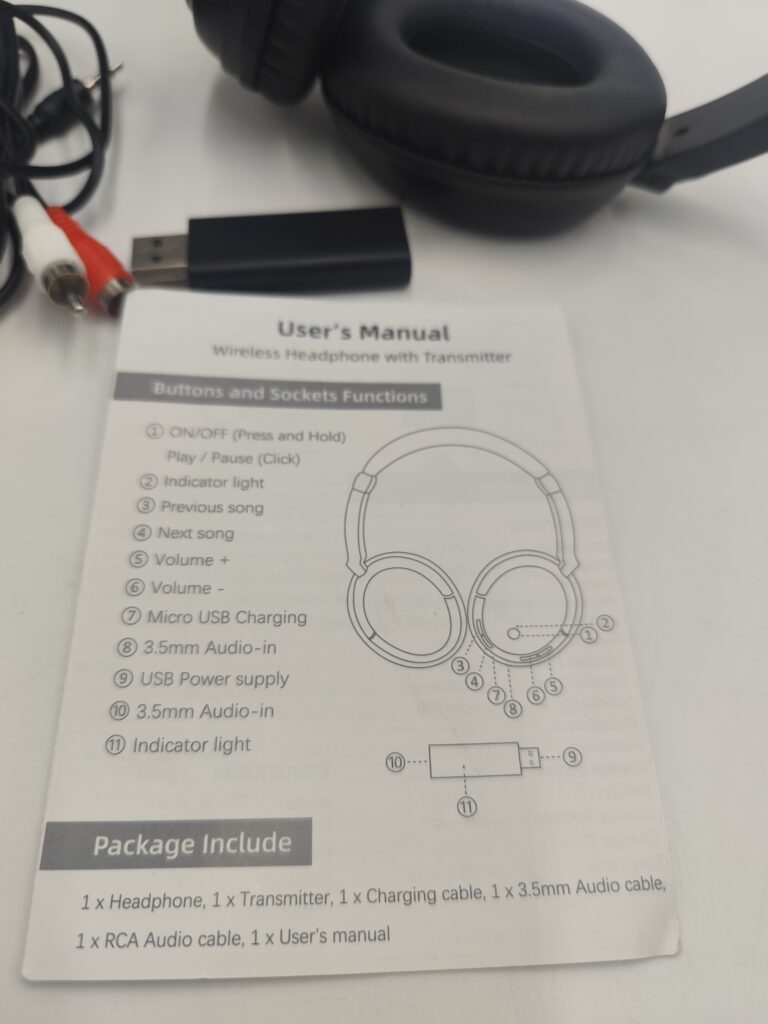 Bezprzewodowe słuchawki stereo z transmiterem USB umożliwiają wygodne słuchanie dźwięku z telewizora, komputera lub innych urządzeń audio bez plączących się kabli. Zestaw pozwala również na korzystanie przewodowe dzięki kablom AUX i RCA.