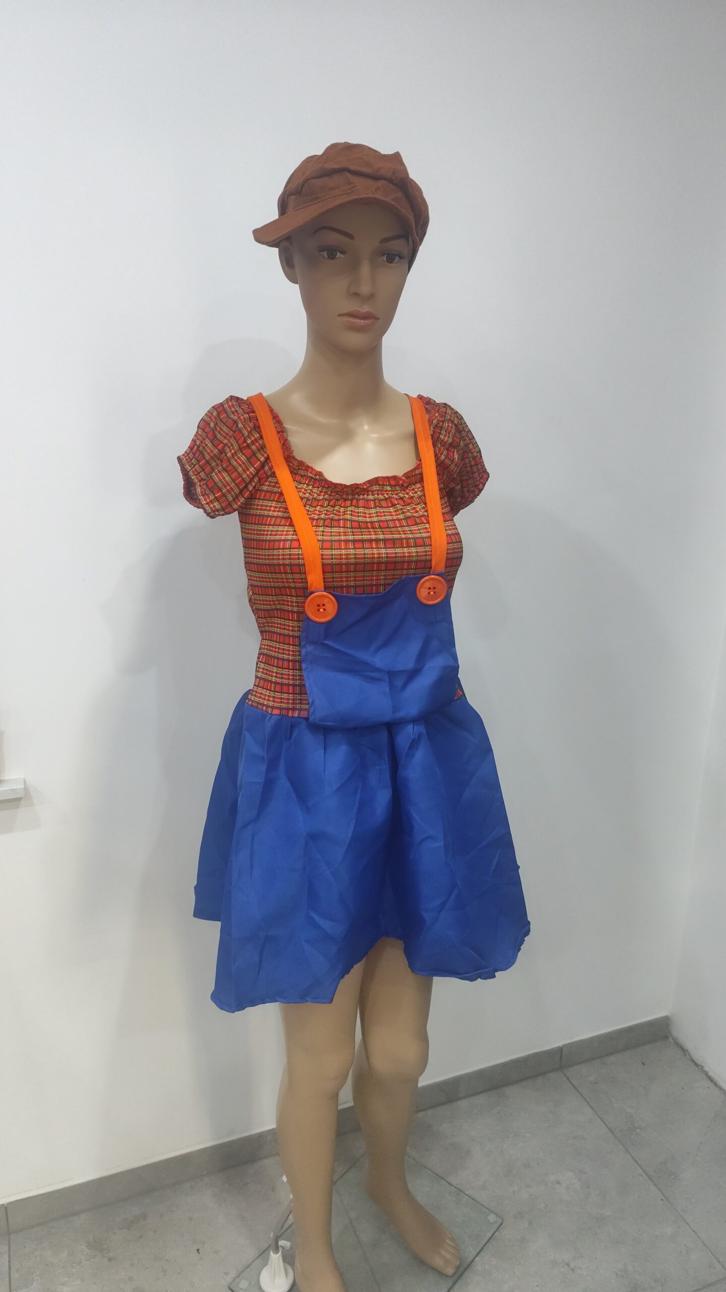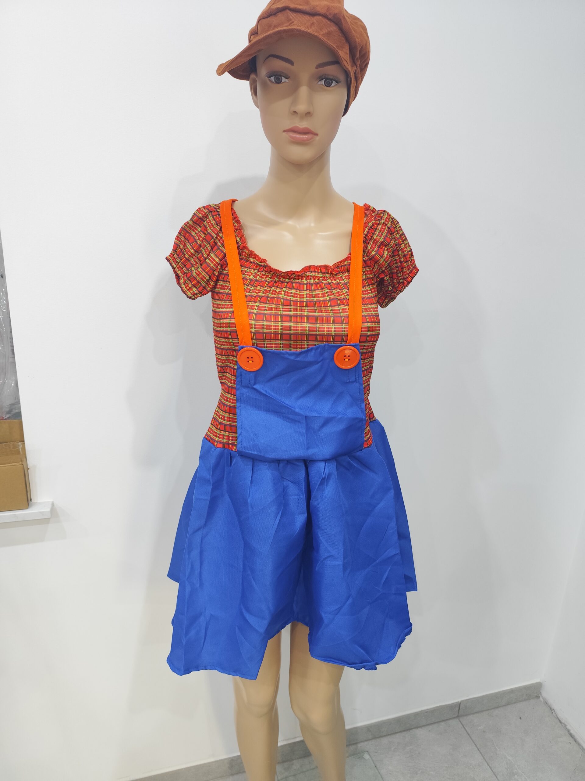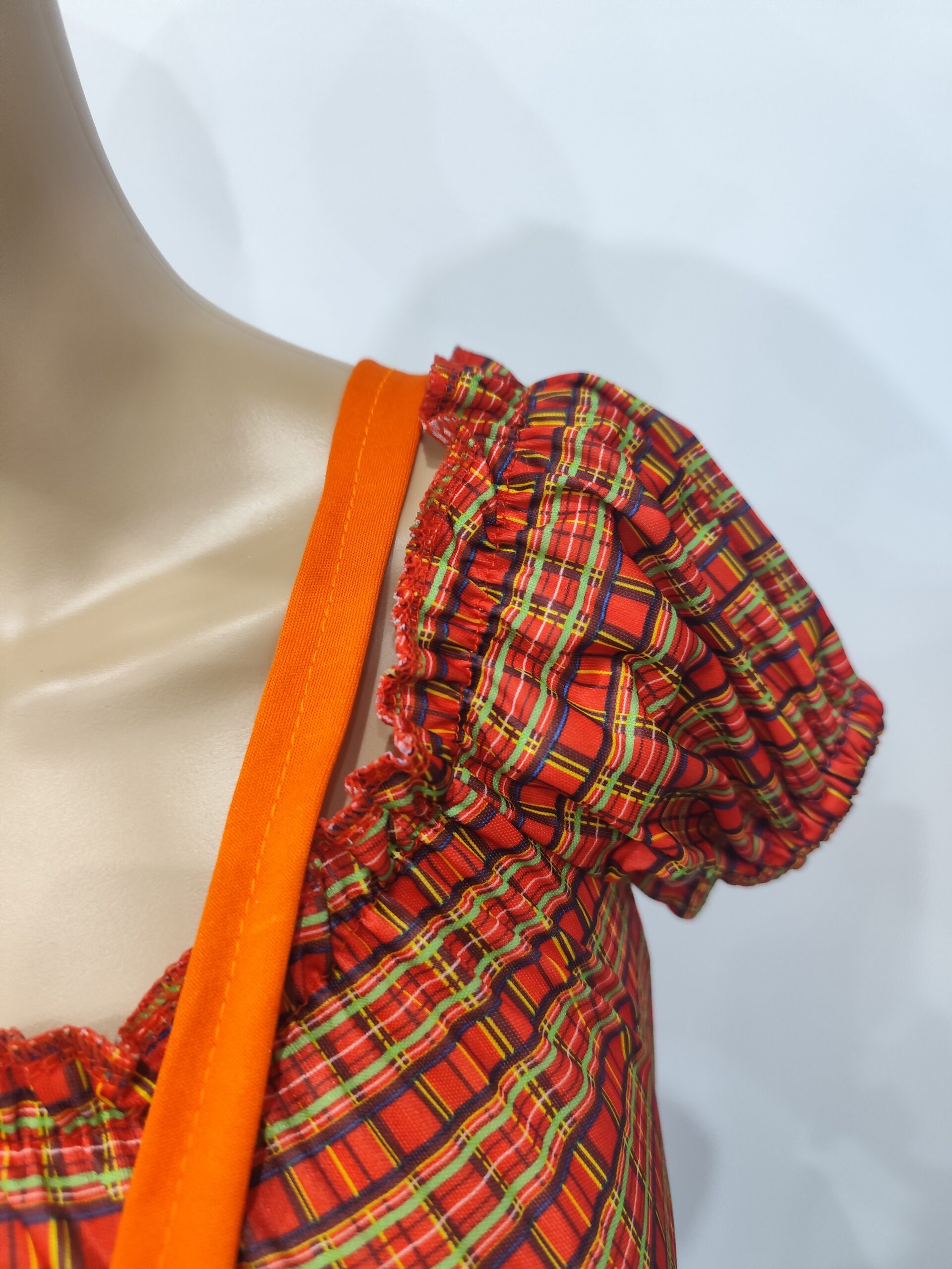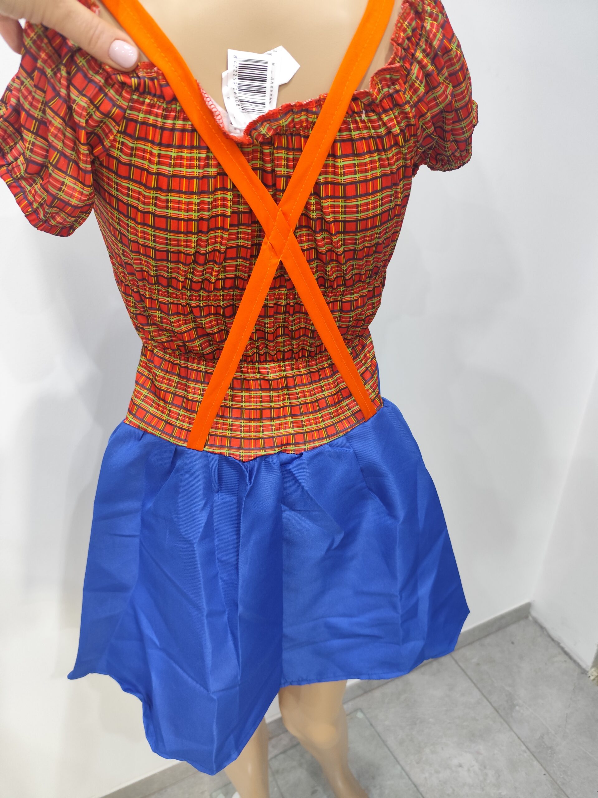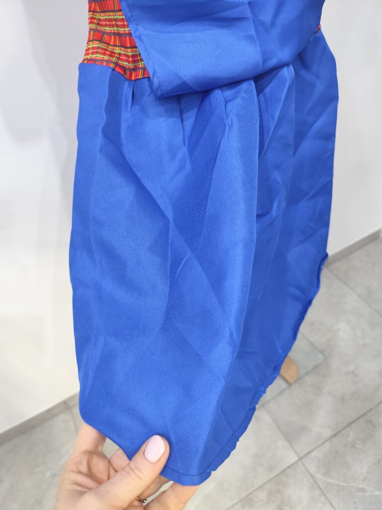 sukienka w kratę z niebieską spódnicą