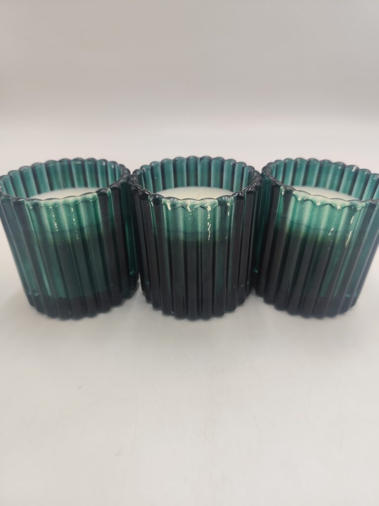 Świeczki  w dekoracyjnych, szklanych słoiczkach w kolorze ciemnej zieleni.