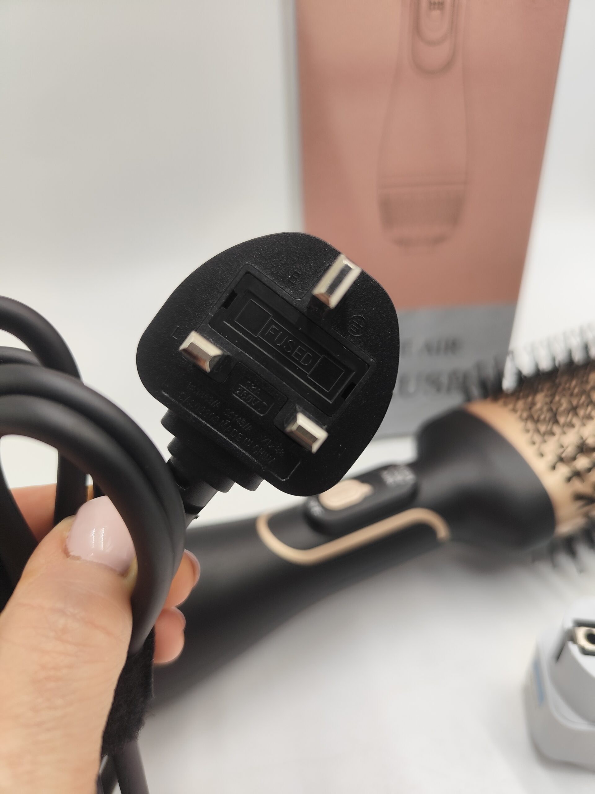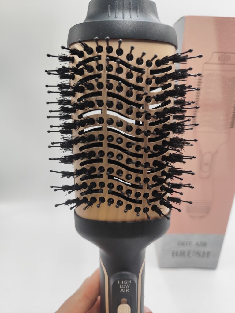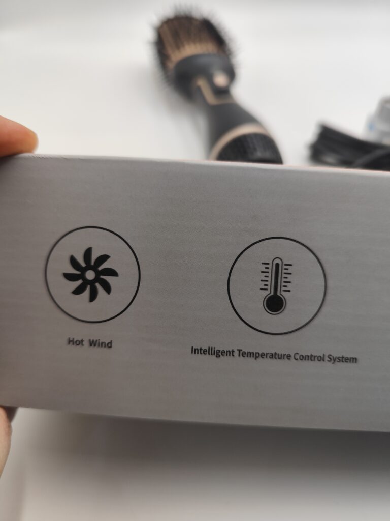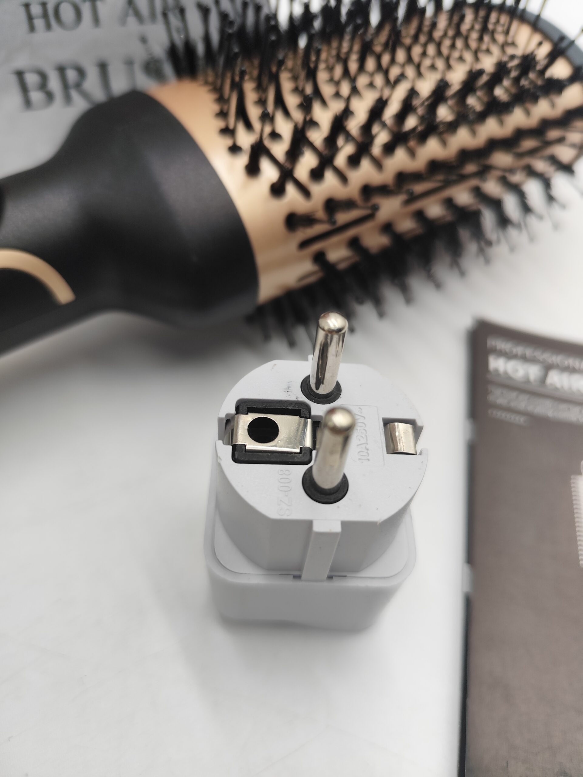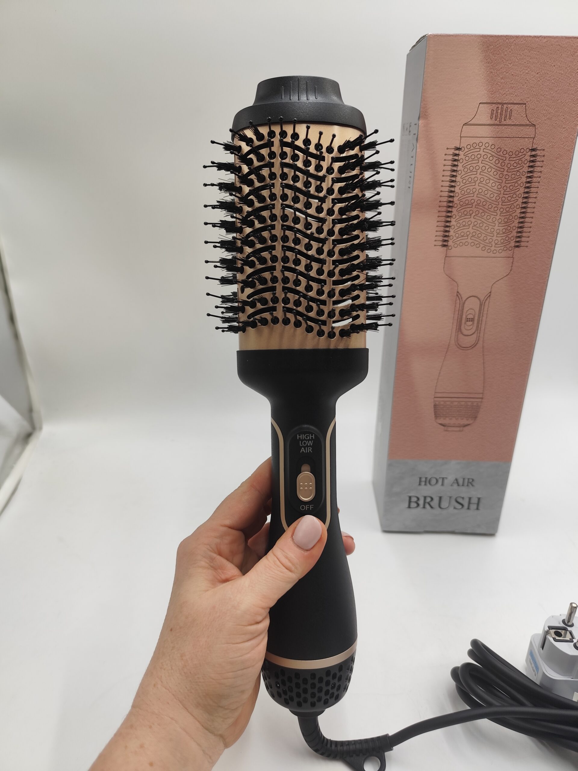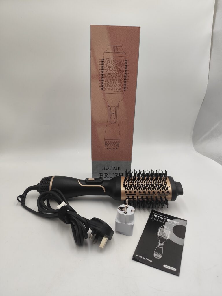 Szczotka 4w1 typu hot air brush – suszy, unosi u nasady, prostuje i podkręca w, w komplecie pudełko, instrukcja i przejściówka EU gratis (oryginalna wtyczka UK).