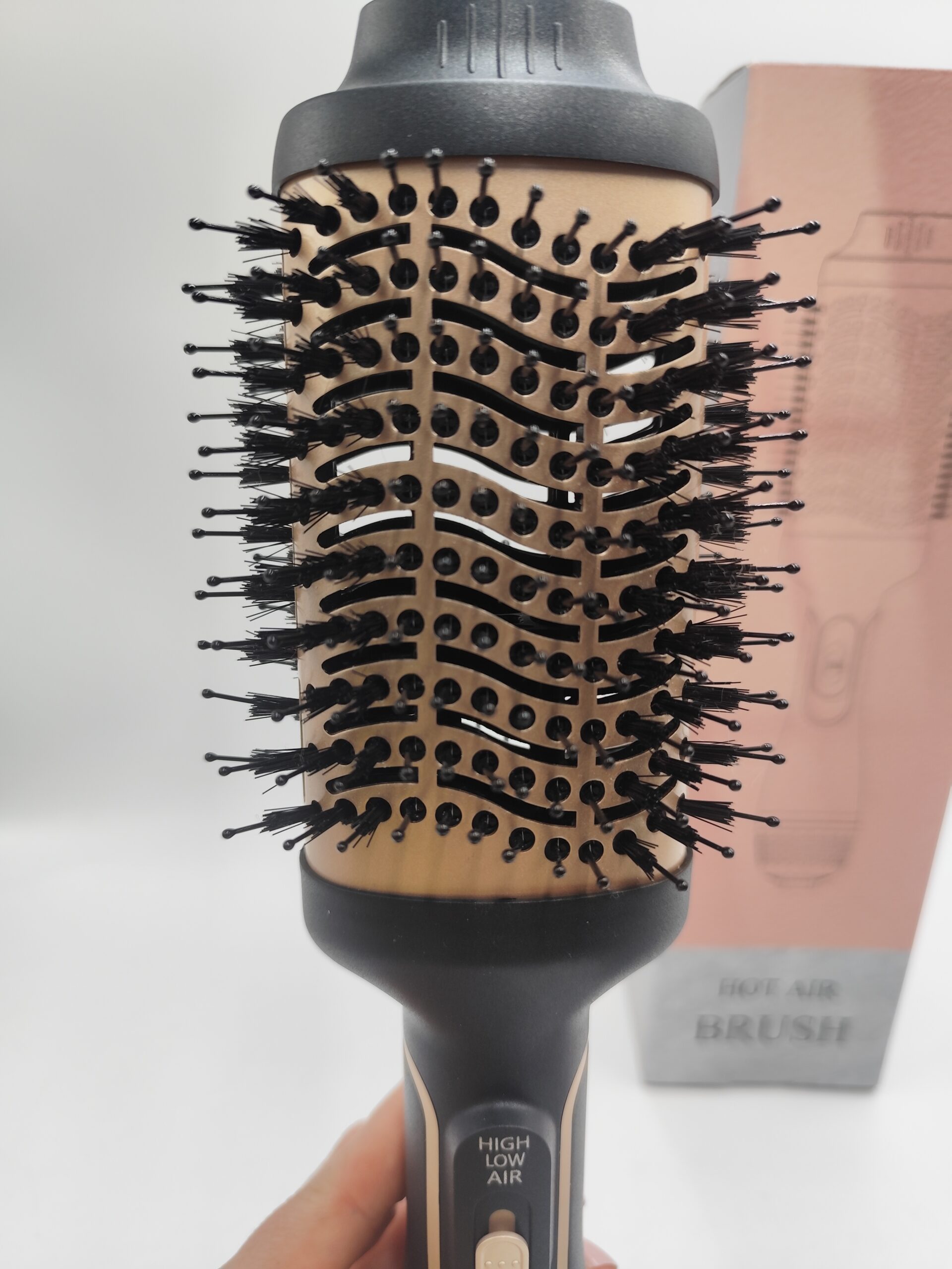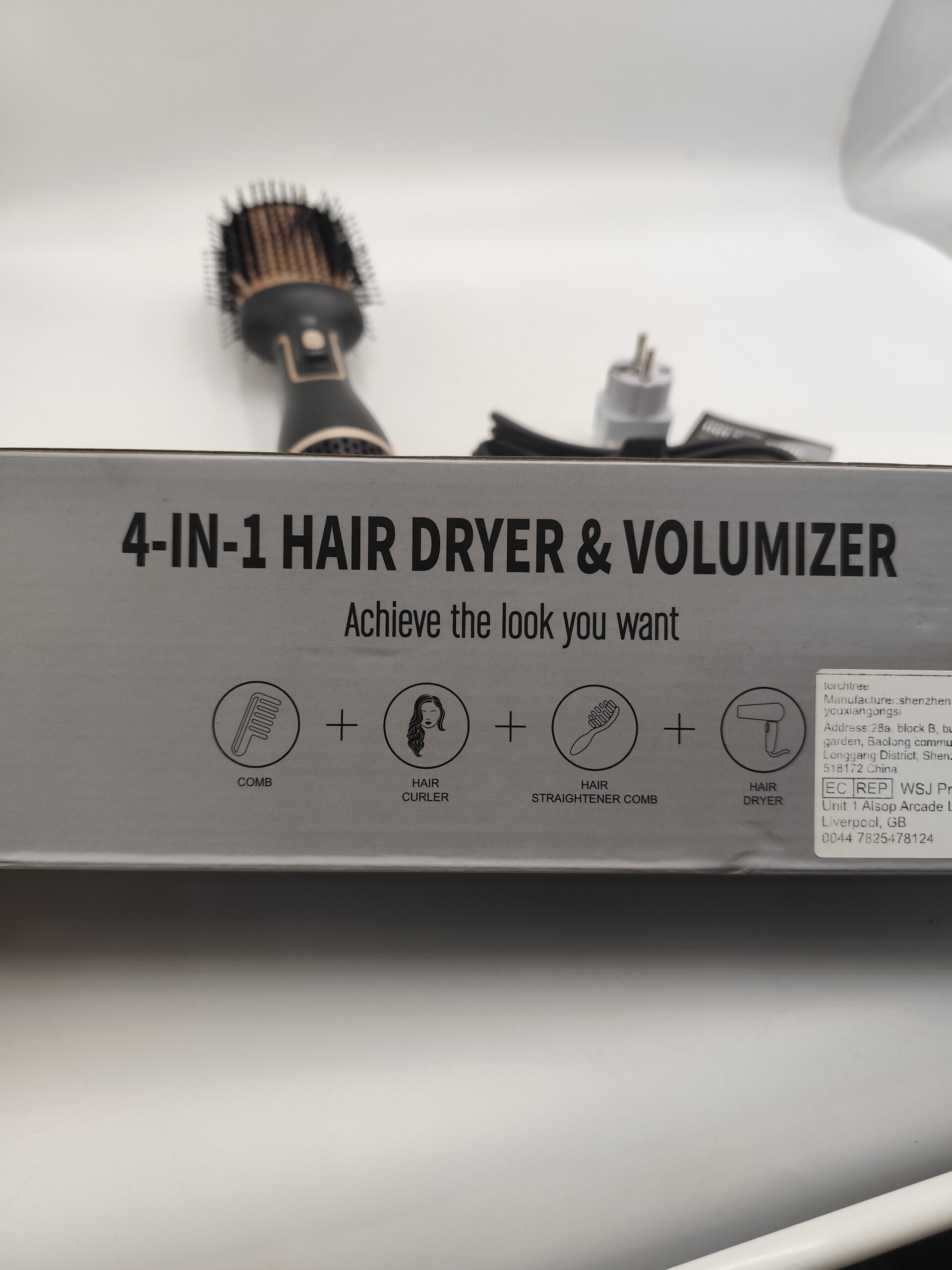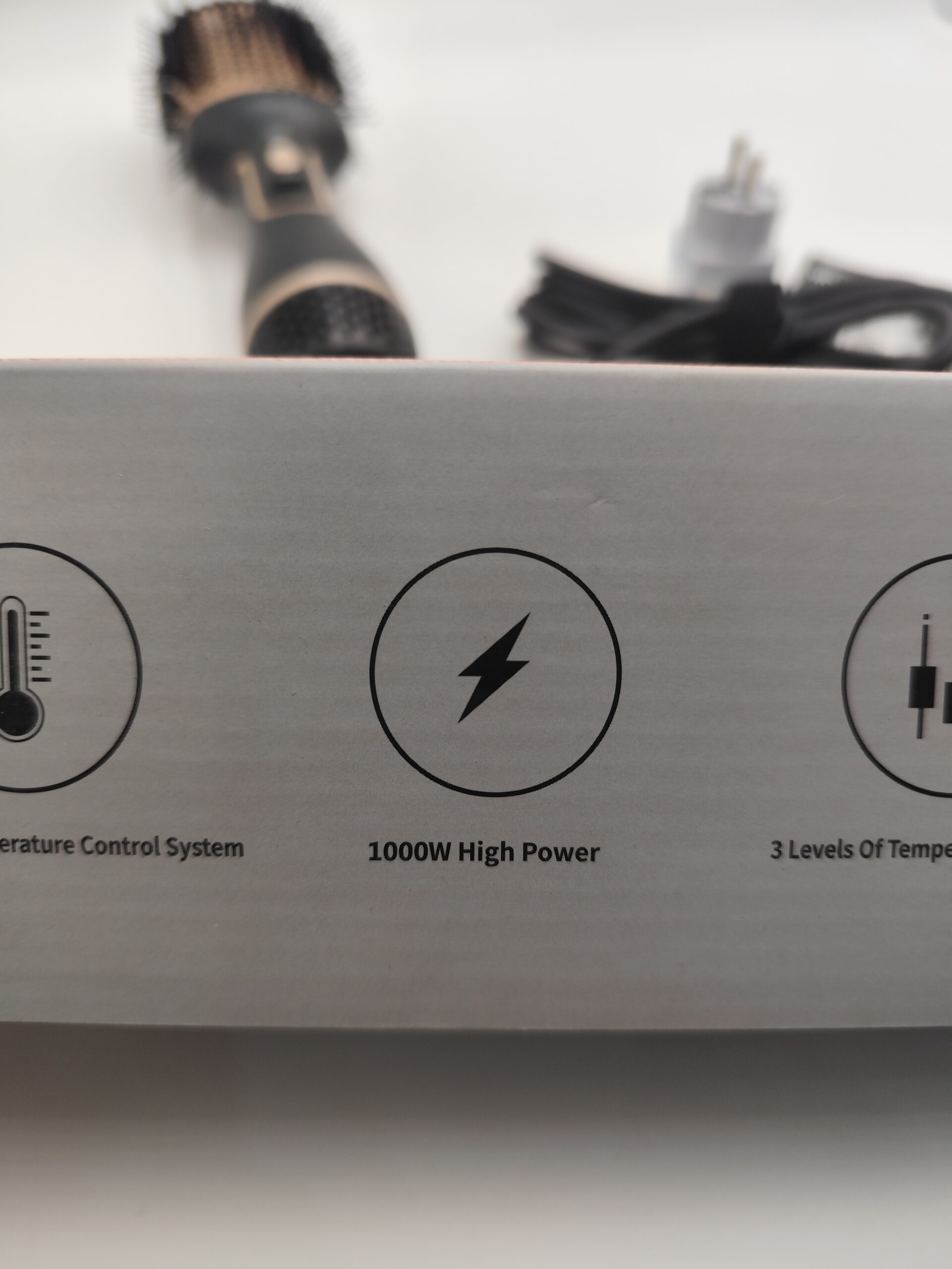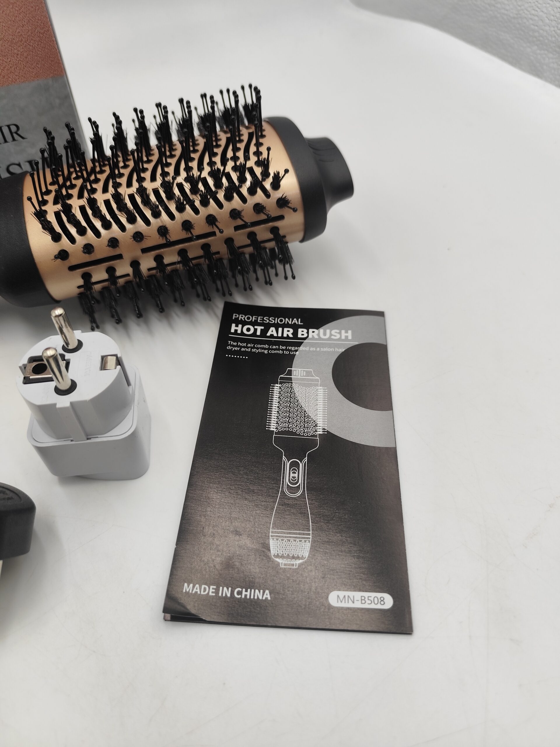 Szczotka 4w1 typu hot air brush – suszy, unosi u nasady, prostuje i podkręca w, w komplecie pudełko, instrukcja i przejściówka EU gratis (oryginalna wtyczka UK).