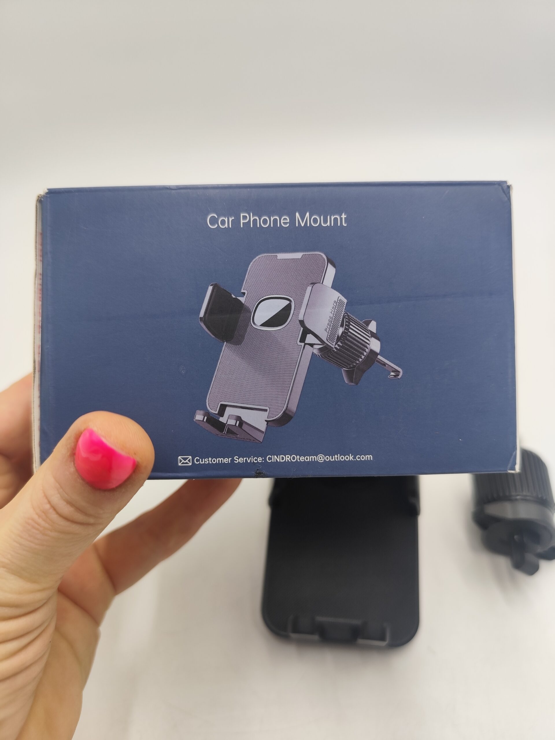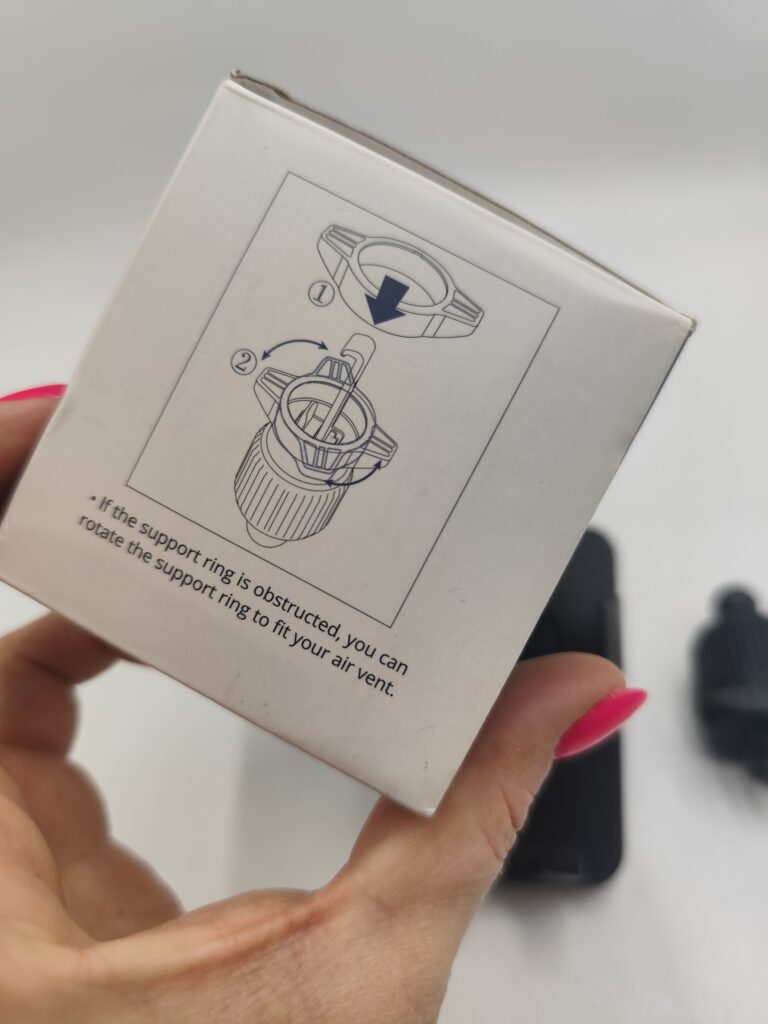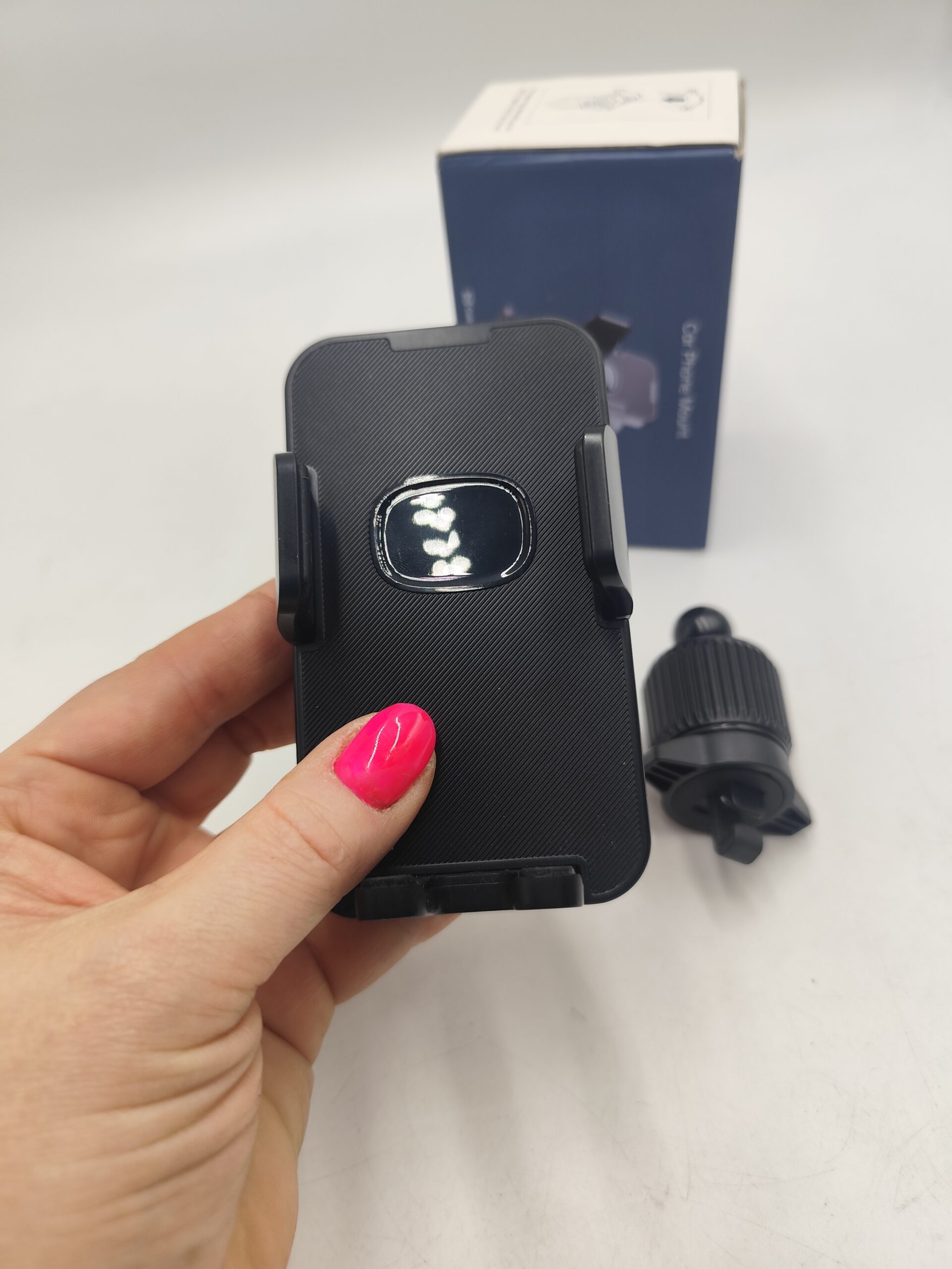 Praktyczny uchwyt samochodowy na telefon montowany w kratce nawiewu. Zapewnia stabilne trzymanie urządzenia podczas jazdy oraz wygodny dostęp do ekranu.