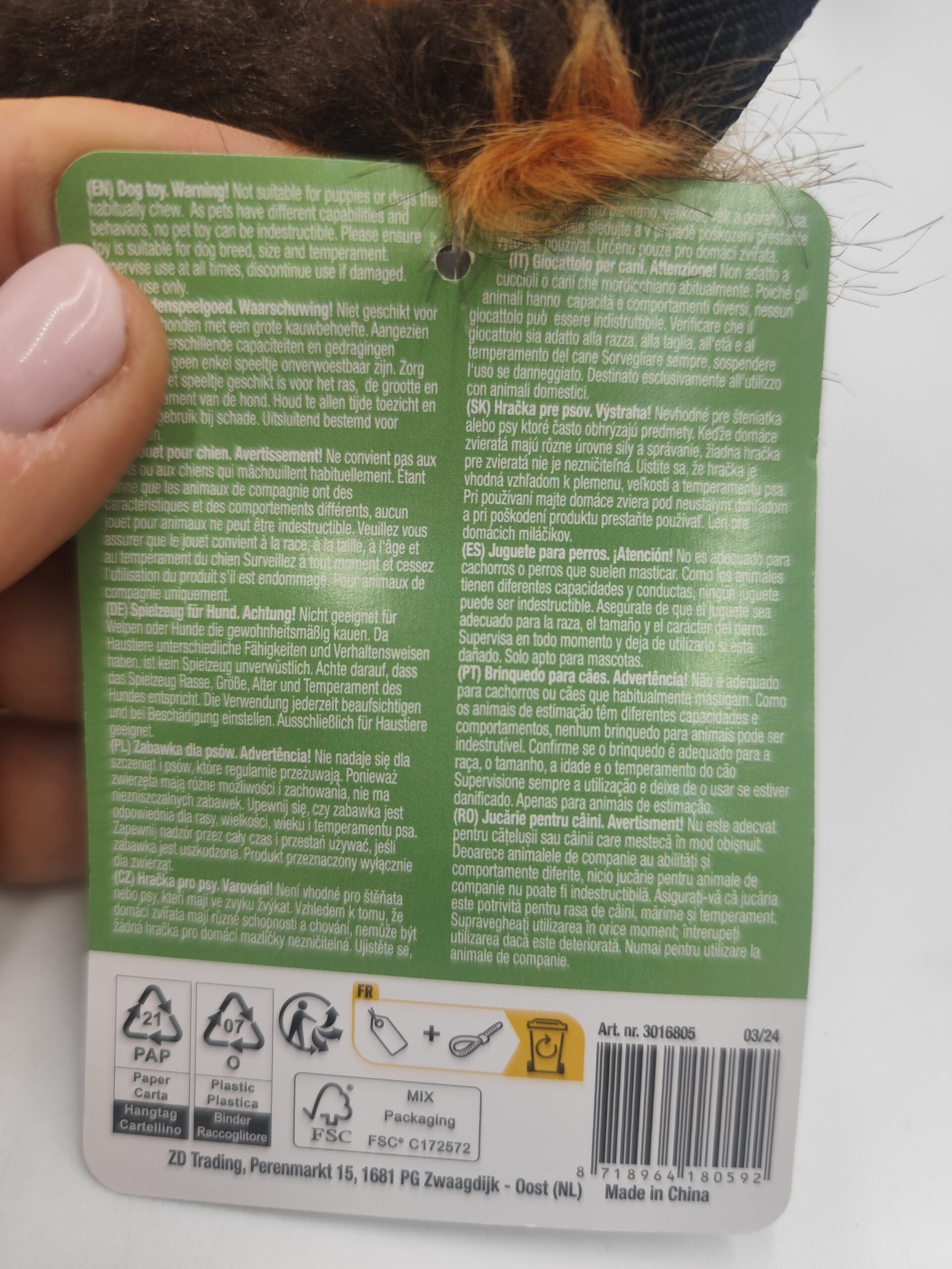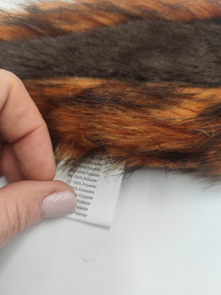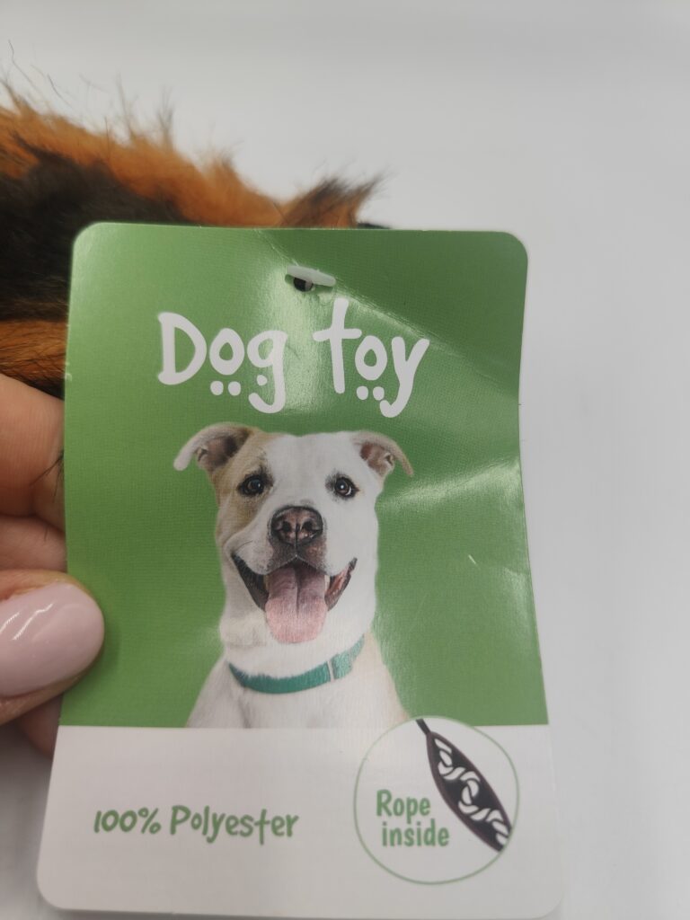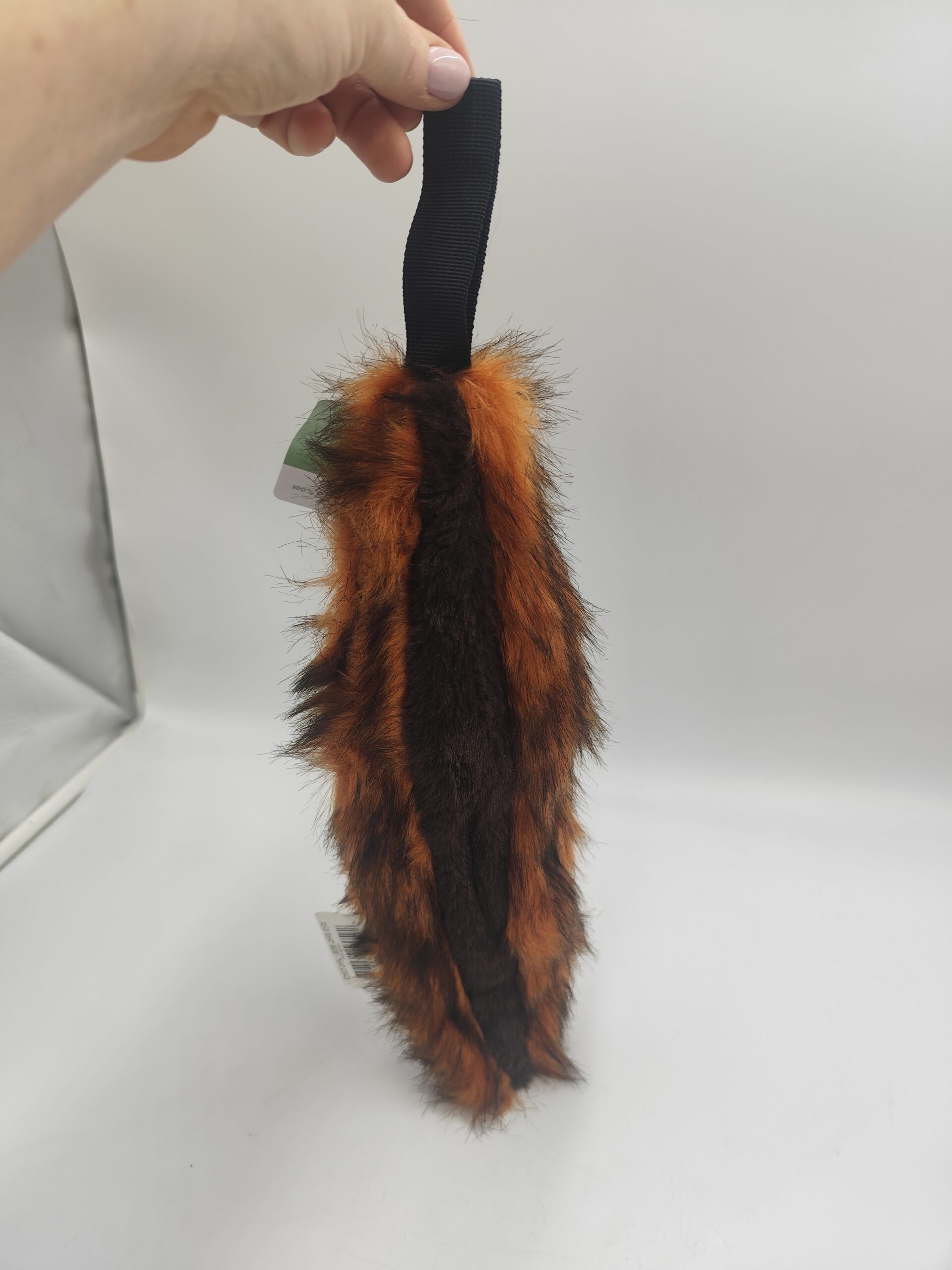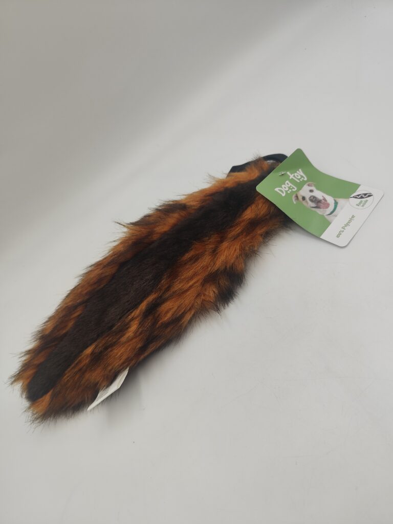 Zabawka dla psa, wykończona miękkim futerkiem w naturalnych kolorach.