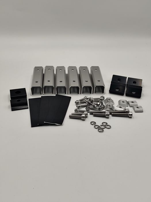 W komplecie wszystkie elementy widoczne na zdjęciach: aluminiowe szyny, śruby, nakrętki, podkładki, gumowe uszczelki i klamry.