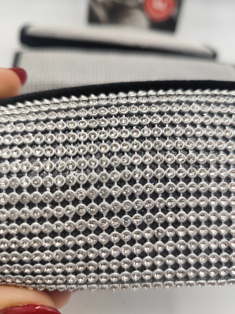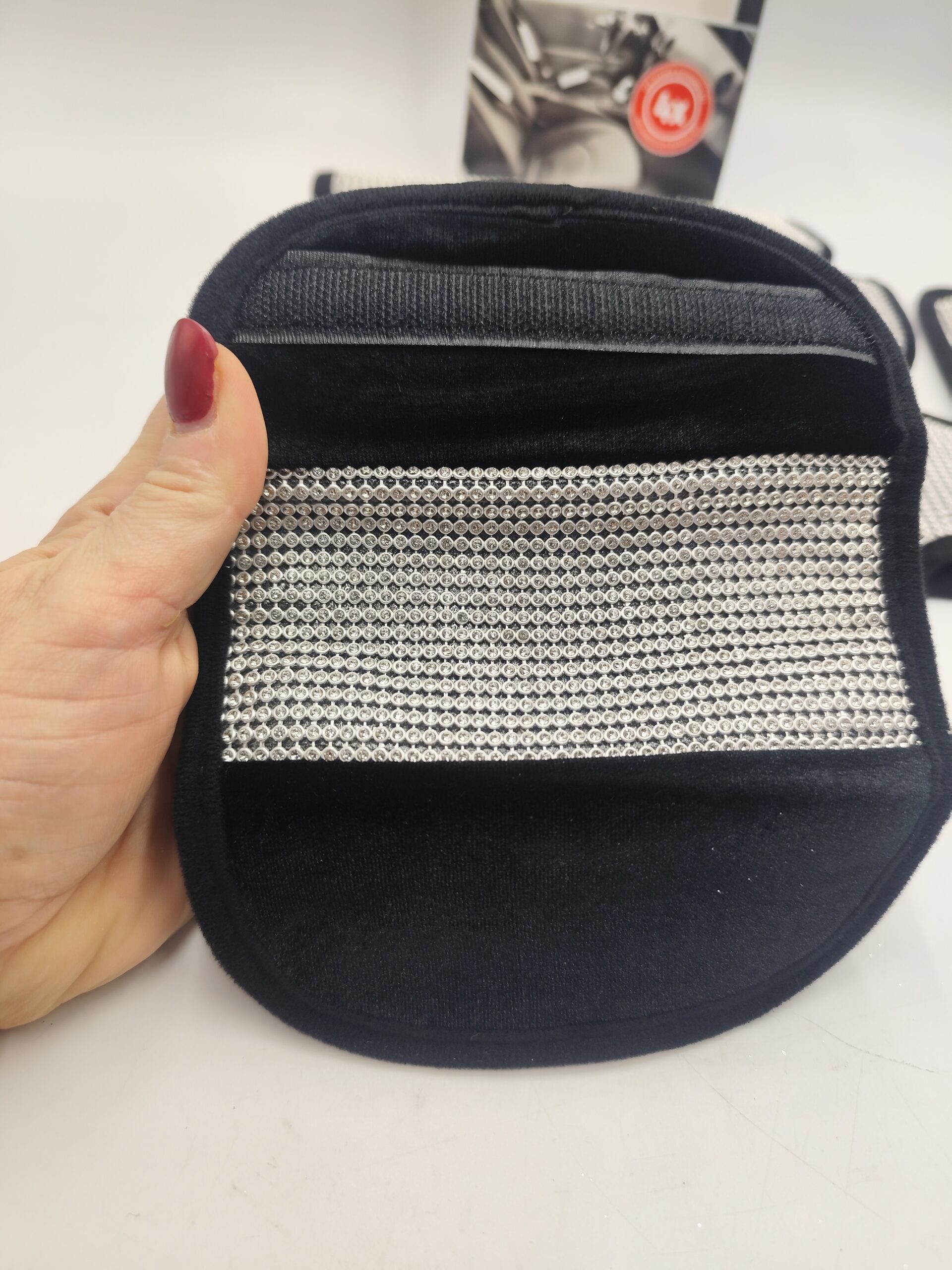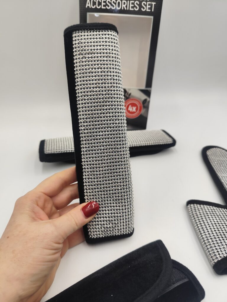 Elegancki, błyszczący design (srebrne zdobienia), montaż na rzep – pasuje do większości aut.